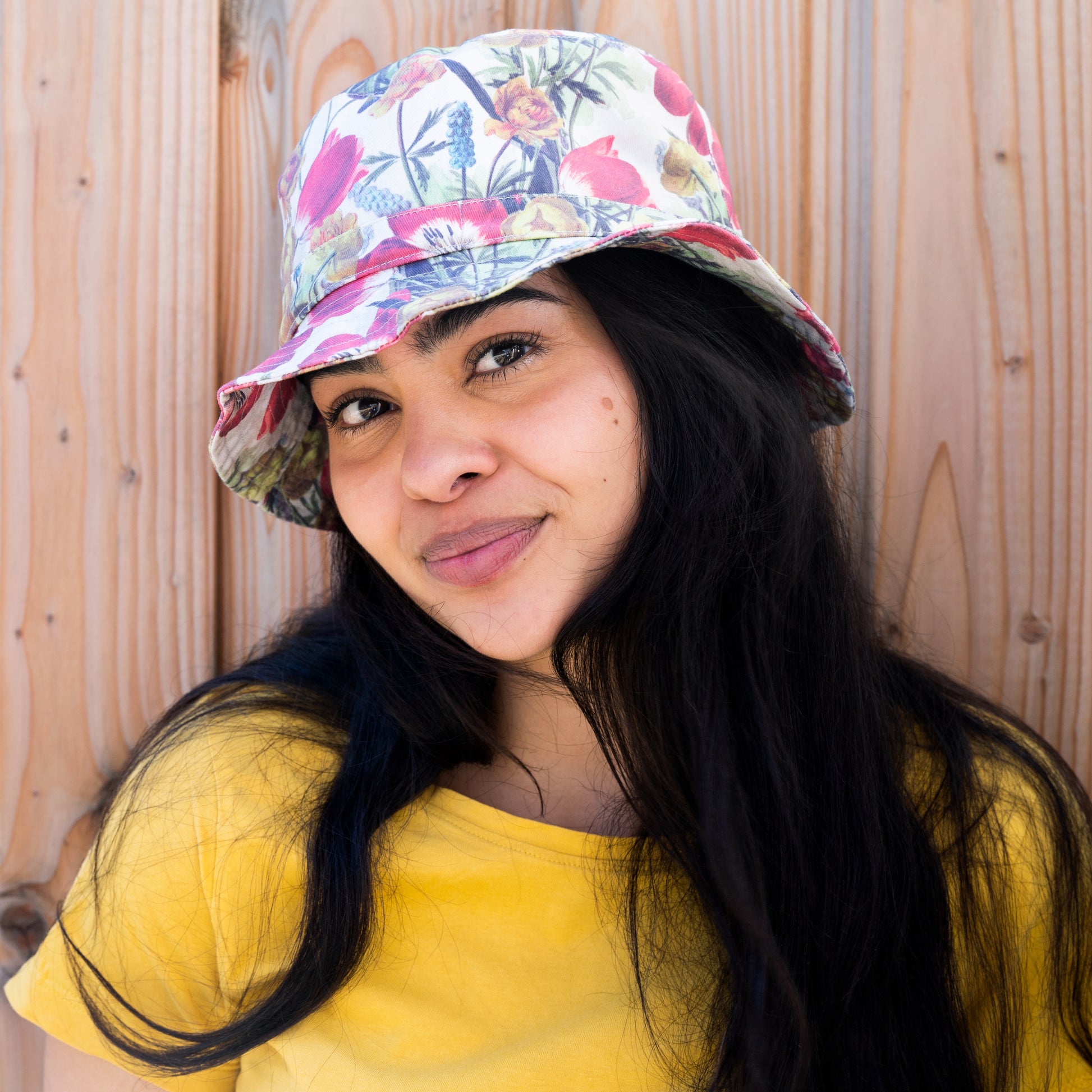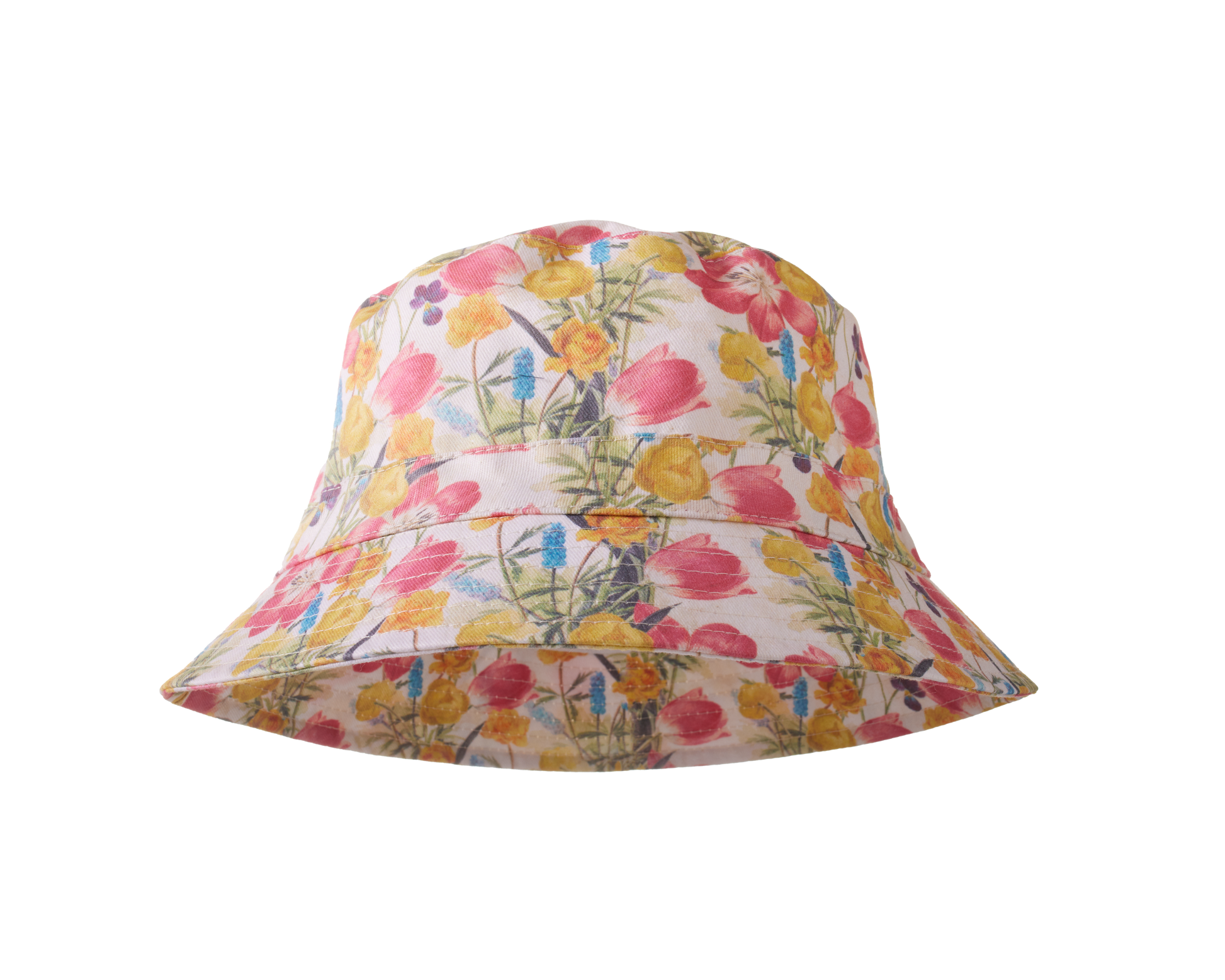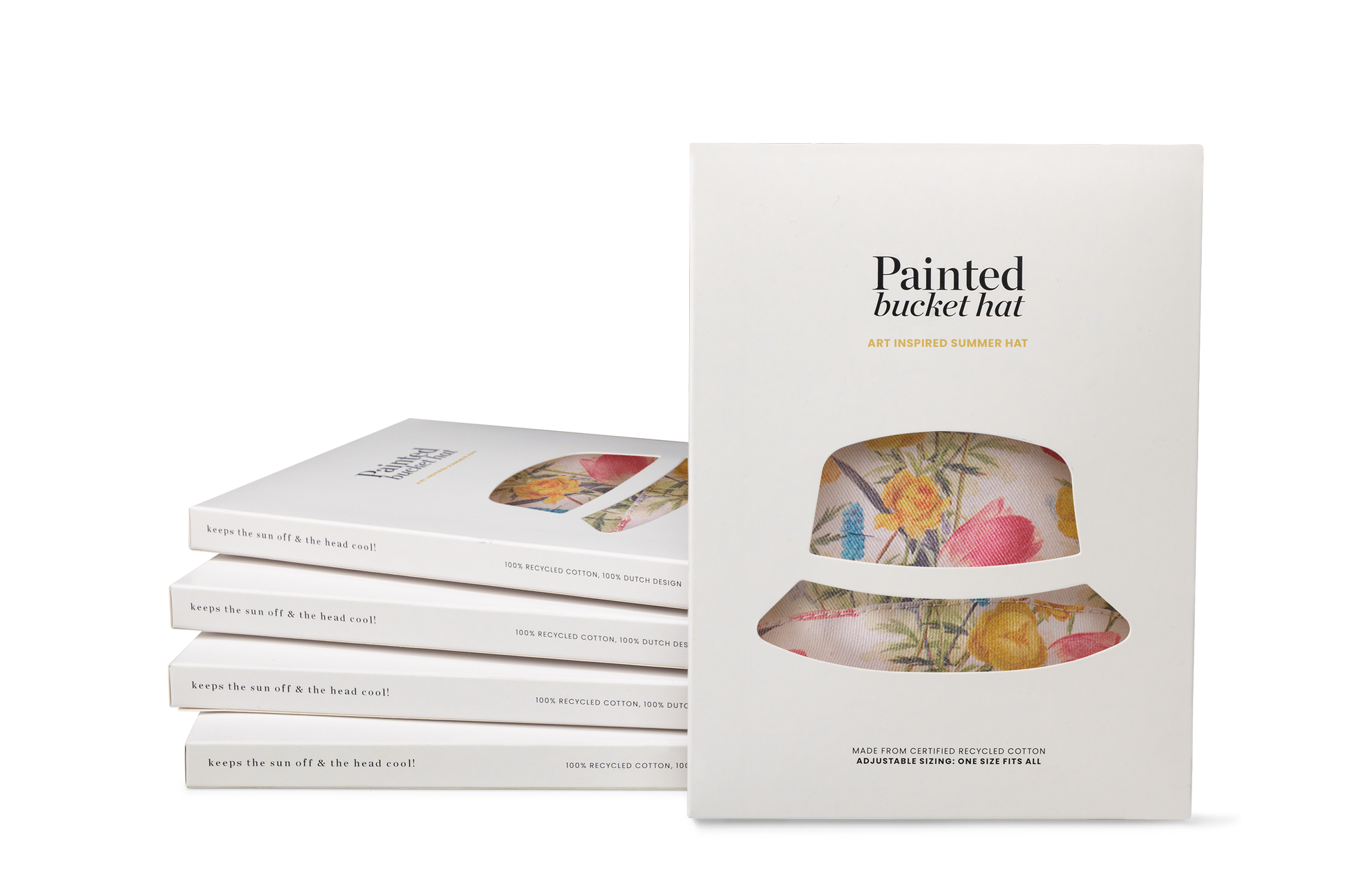 Diese Baumwollmütze ist inspiriert von einem winzigen Aquarell des niederländischen Malers Willem van Leen aus dem 18. Jahrhundert: „Bouquet aus Tulpen, Veilchen, blauen Trauben und Dottern“. Das Original misst nur 21 x 14,4 cm und ist eine der vielen Studien, die Van Leen unternahm, um seine Fähigkeiten für den erfolgreichen Blumenmaler zu üben, der er später einmal werden sollte.