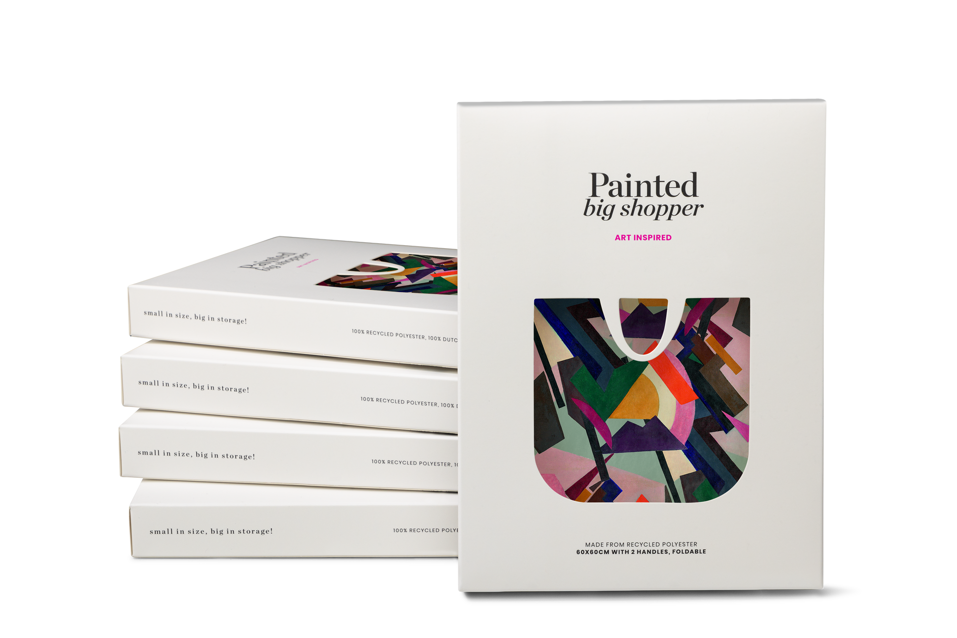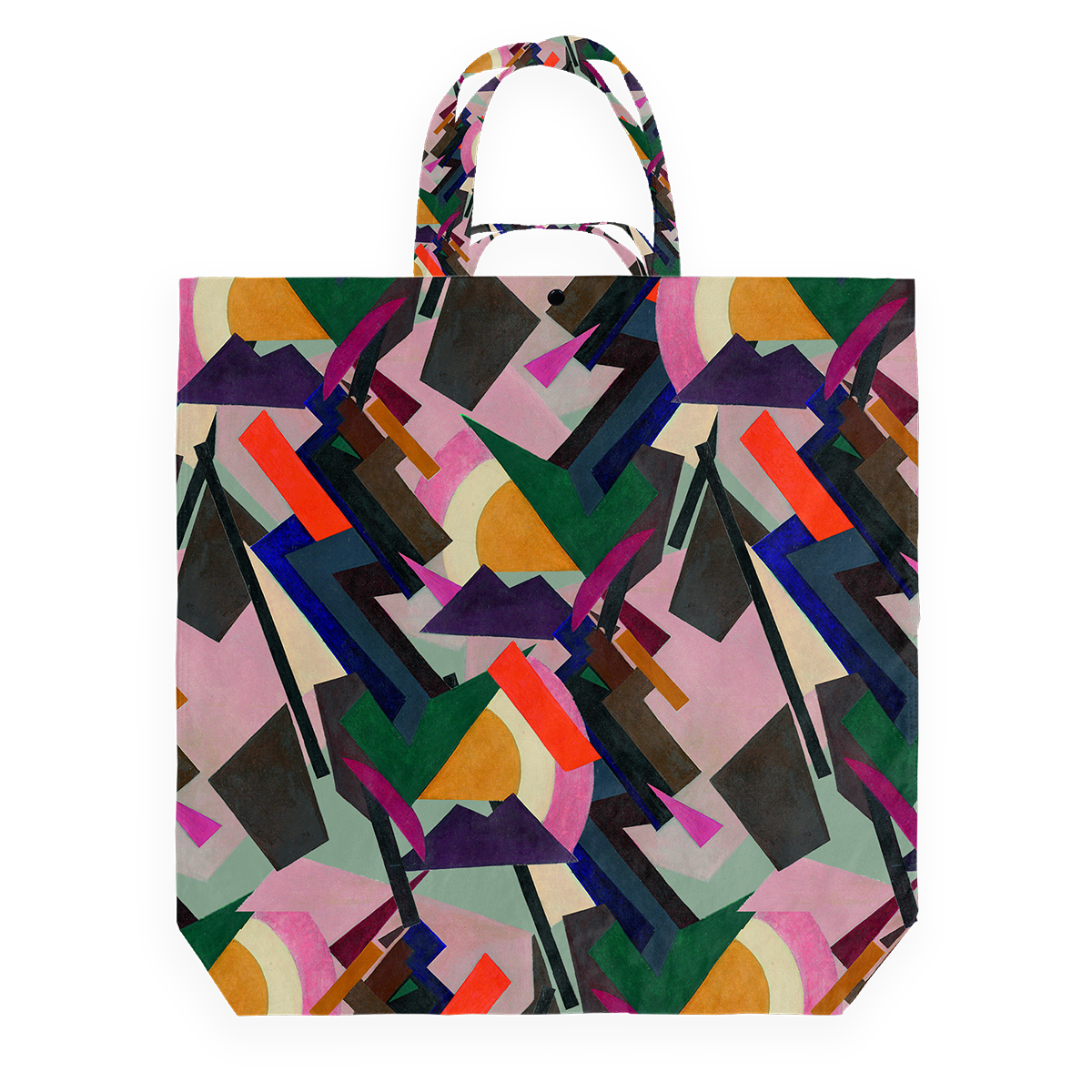 Deze grote shopper is geïnspireerd op een collage van de Russische schilder Olga Rozanova uit het begin van de 20e eeuw. Ze noemde haar collages 'paste-ons': een combinatie van vlakken, lijnen en schijven en geen enkele incorporatie van echte objecten. Rozanova maakte deel uit van de 'Supremus', een groep avant-gardekunstenaars (onder leiding van Malevich) die kunst veranderden in een kosmische confrontatie van geometrische vormen, waarbij ze alle academische kunstregels omverwierpen.