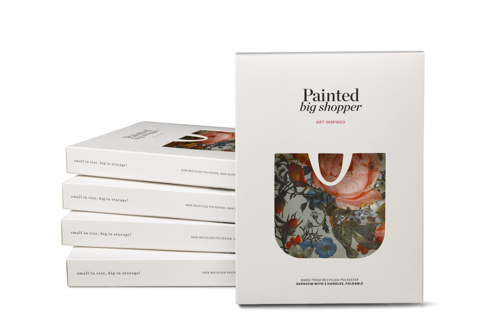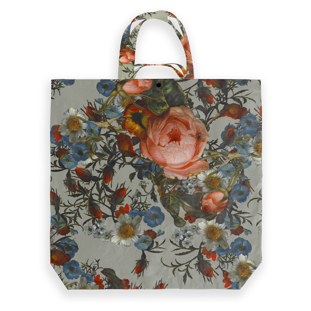 Deze grote shopper is geïnspireerd door een van de vele kleurrijke schilderijen van Rachel Ruysch! Geboren in een bloeiend tijdperk in Nederland, revolutioneerde ze de bloemcomposities in de 17e en 18e eeuw. Met de collectie van een botanist als vader had ze toegang tot het schilderen van zeldzame bloemen en dieren. Haar talent leverde haar toestemming op van haar vader om een kunstopleiding te volgen! Hoewel het niet uniek was vanwege een progressieve houding ten opzichte van vrouwelijke kunstenaars, bleef het ongebruikelijk.