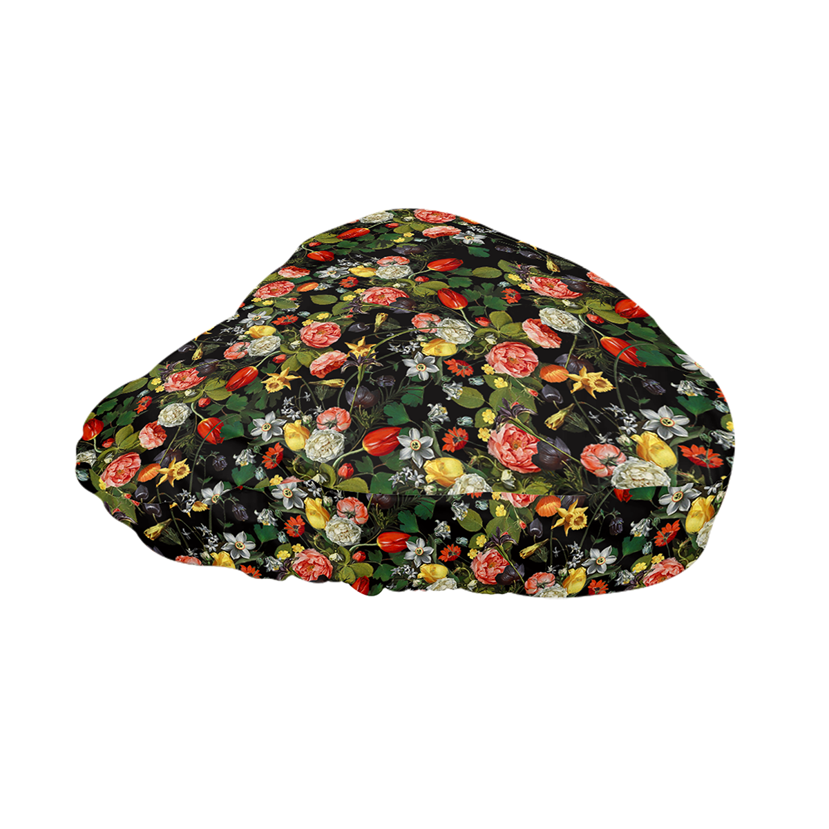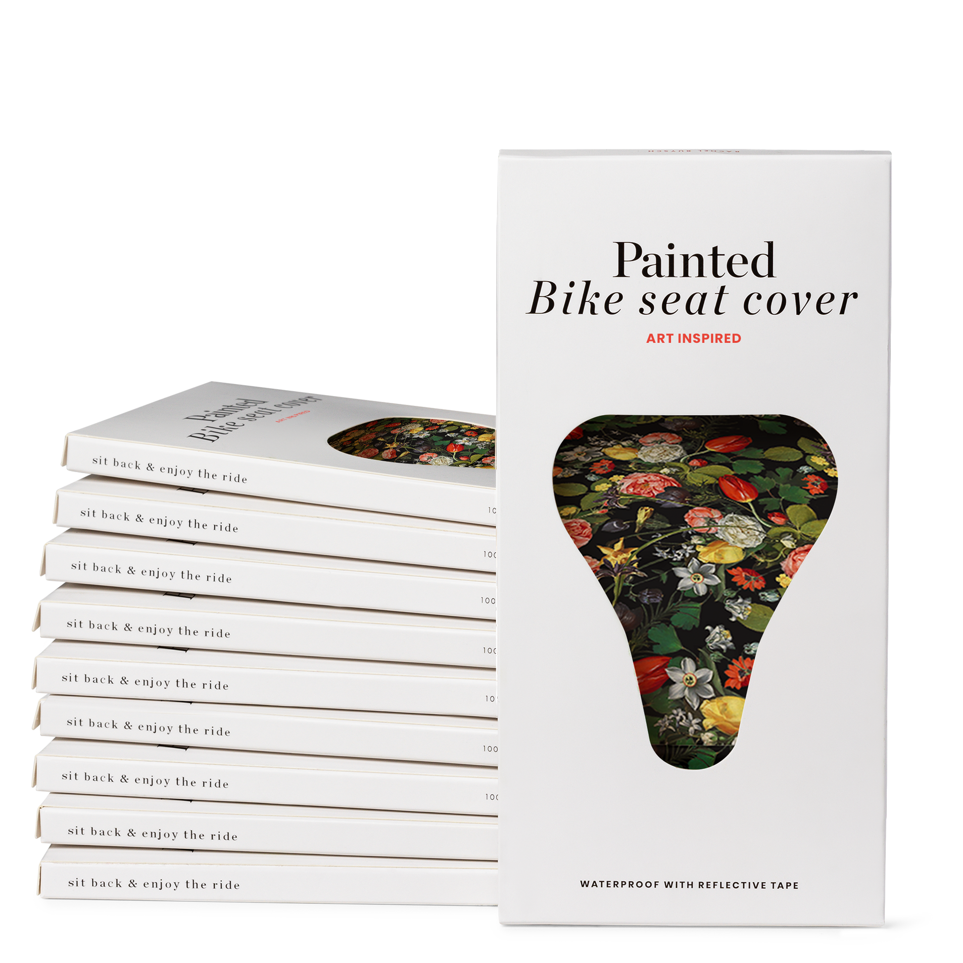 Deze zadelhoes voor de fiets is geïnspireerd op een sprankelend boeket in een groter stilleven geschilderd door Clara Peeters. Clara werd geboren rond 1588 in Antwerpen en was een van de weinige professionele vrouwelijke schilders van de 17e eeuw . Haar banketstukken, bekend om hun gedetailleerde weergave van prachtige bloemen naast eten, kopjes en andere attributen, lieten een invloed achter op schilders uit de Noordelijke Nederlanden.