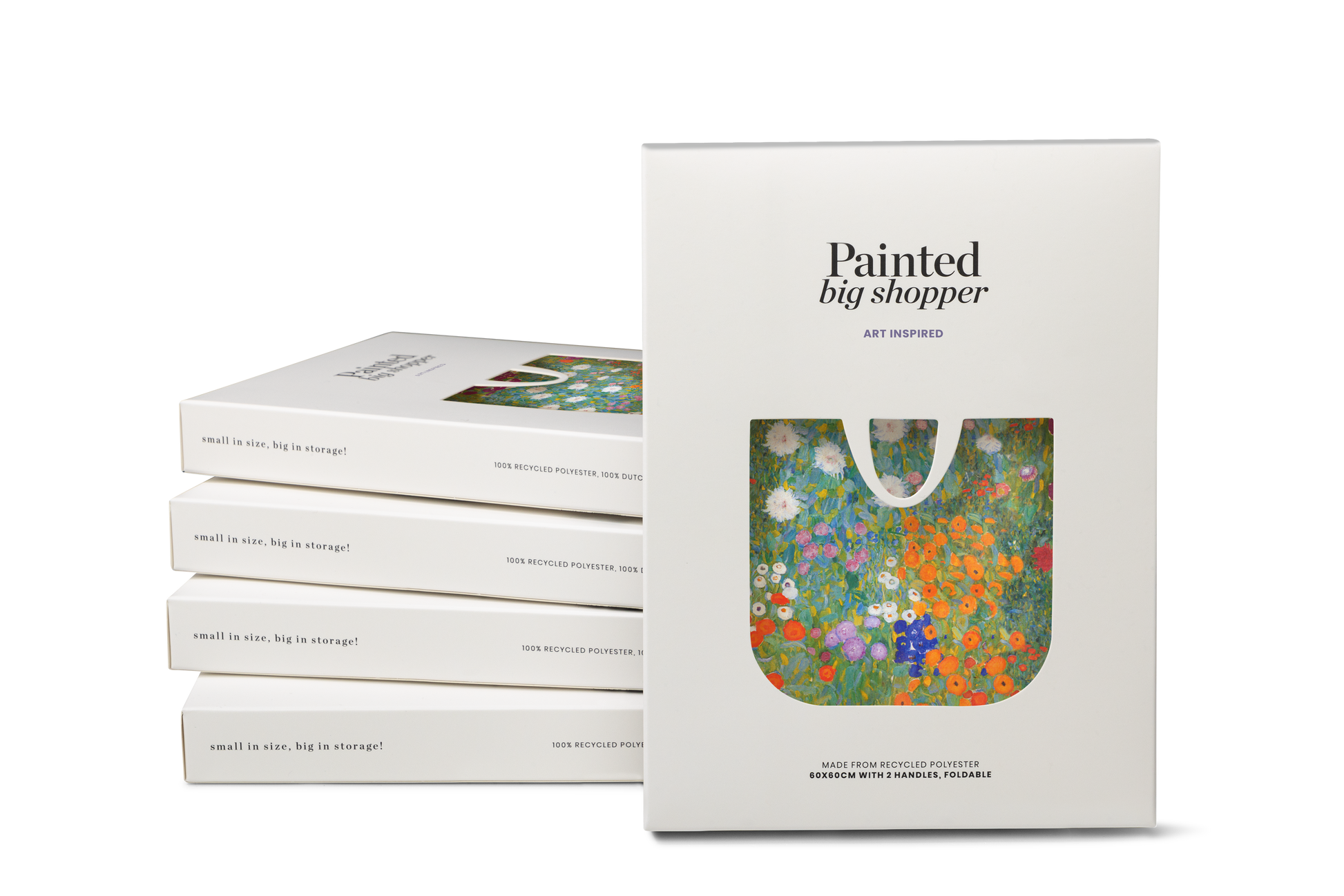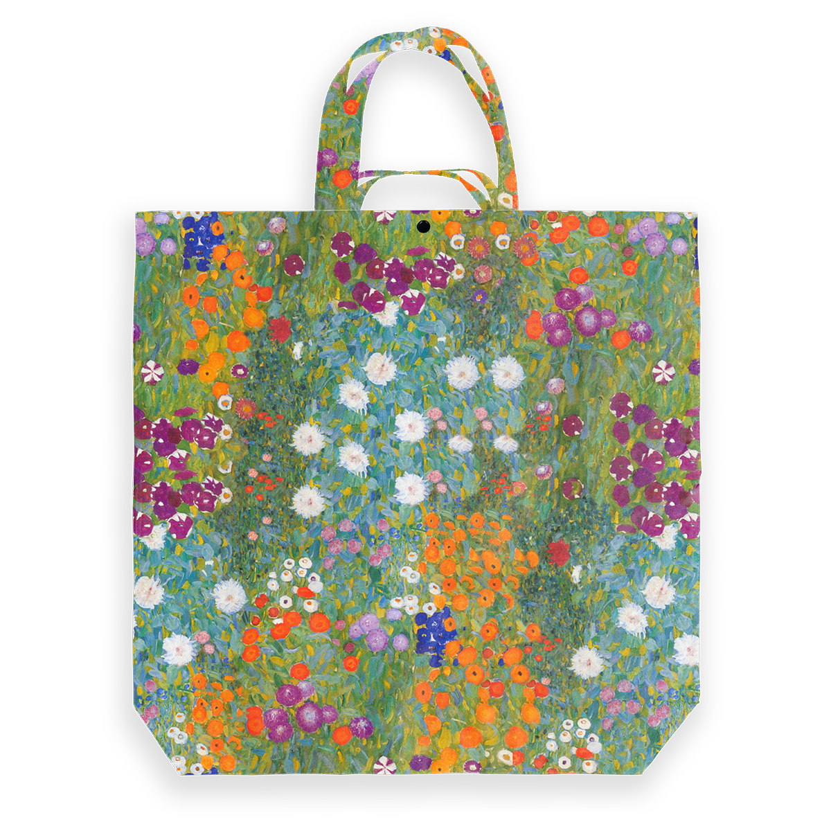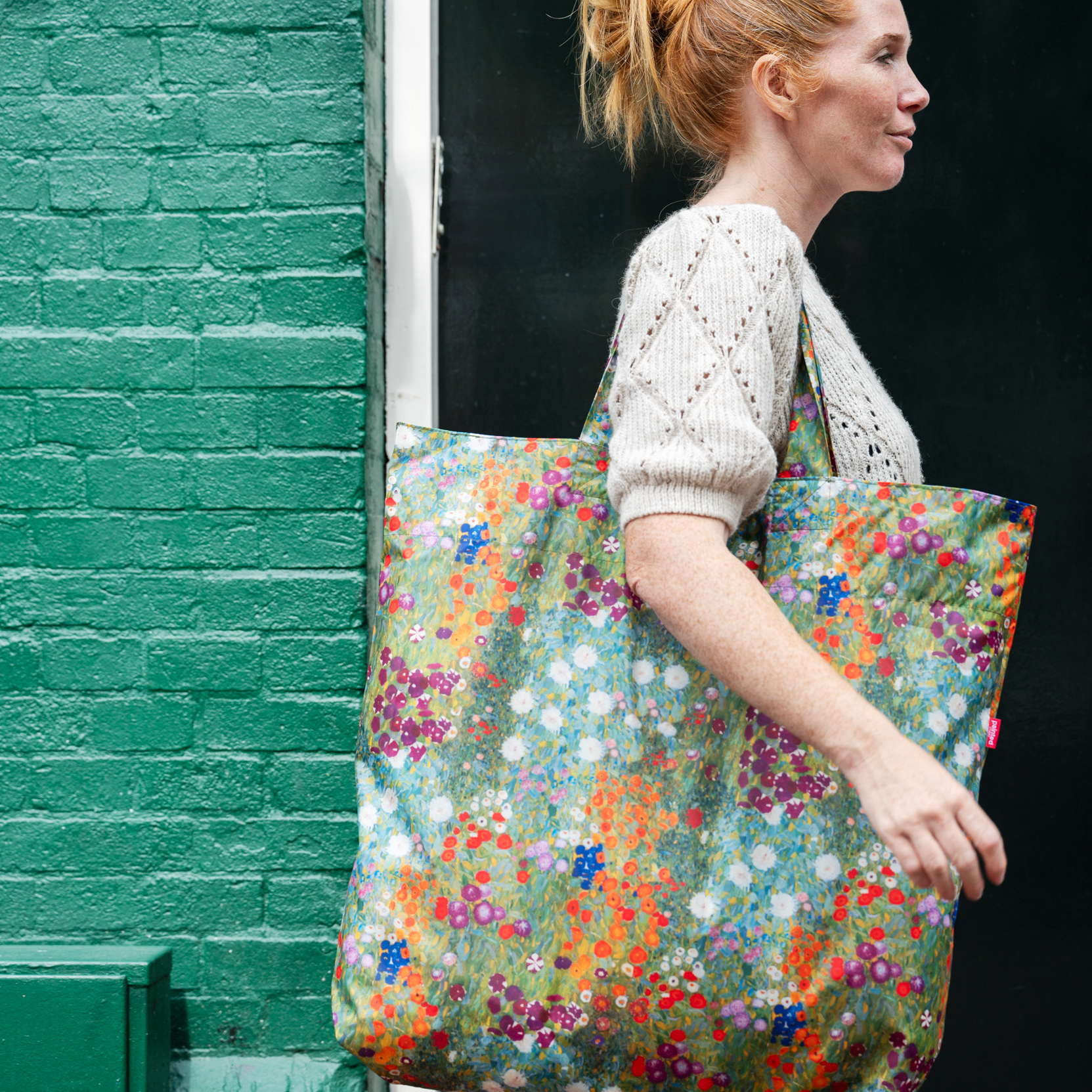 This big shopper is inspired by Gustav Klimt’s brilliantly coloured painting of a blossoming flower garden. Most of us know Klimt from his romantic portraits of women with a lot of gold and glitter, but Klimt made deeply researched paintings of the natural world, especially after he visited a large Van Gogh exhibition in Vienna in 1906.