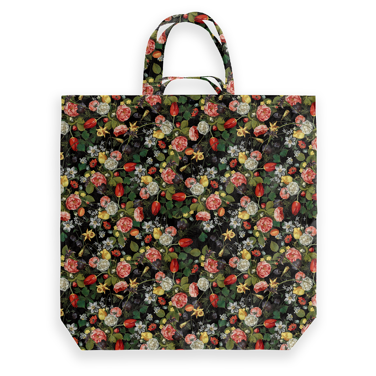This big shopper is inspired by a sparkling bouquet featured in a larger still-life painted by Clara Peeters. Born around 1588 in Antwerp, Clara was among the few professional female painters of the 17th century. Her banquet pieces, known for their detail in depicting magnificent flowers alongside food, cups and other attributes, left an influence on painters from the Northern Netherlands.