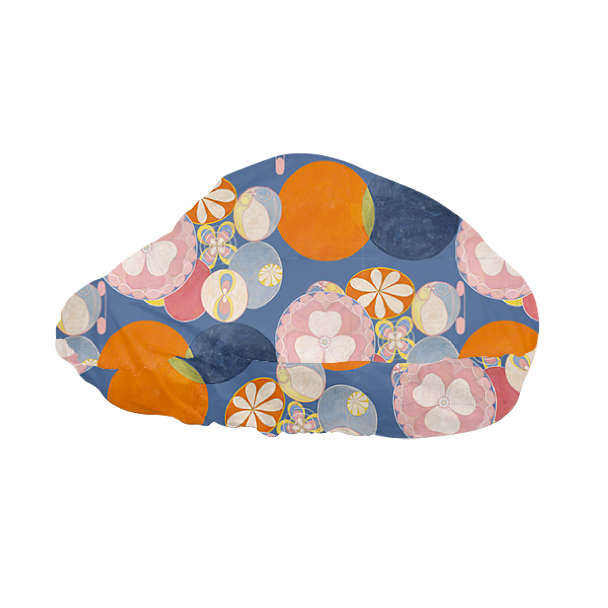 This bike seat cover is inspired by Painting No. 2, part of a series of ten wall-sized paintings Swedish painter Hilma af Klint made for a temple (which was never built). Af Klint was interested in spiritualism and the subconscious. She was one of the first artists to experiment with automatic drawing, a technique in which the artist allows her hand to move freely across the paper without conscious control.