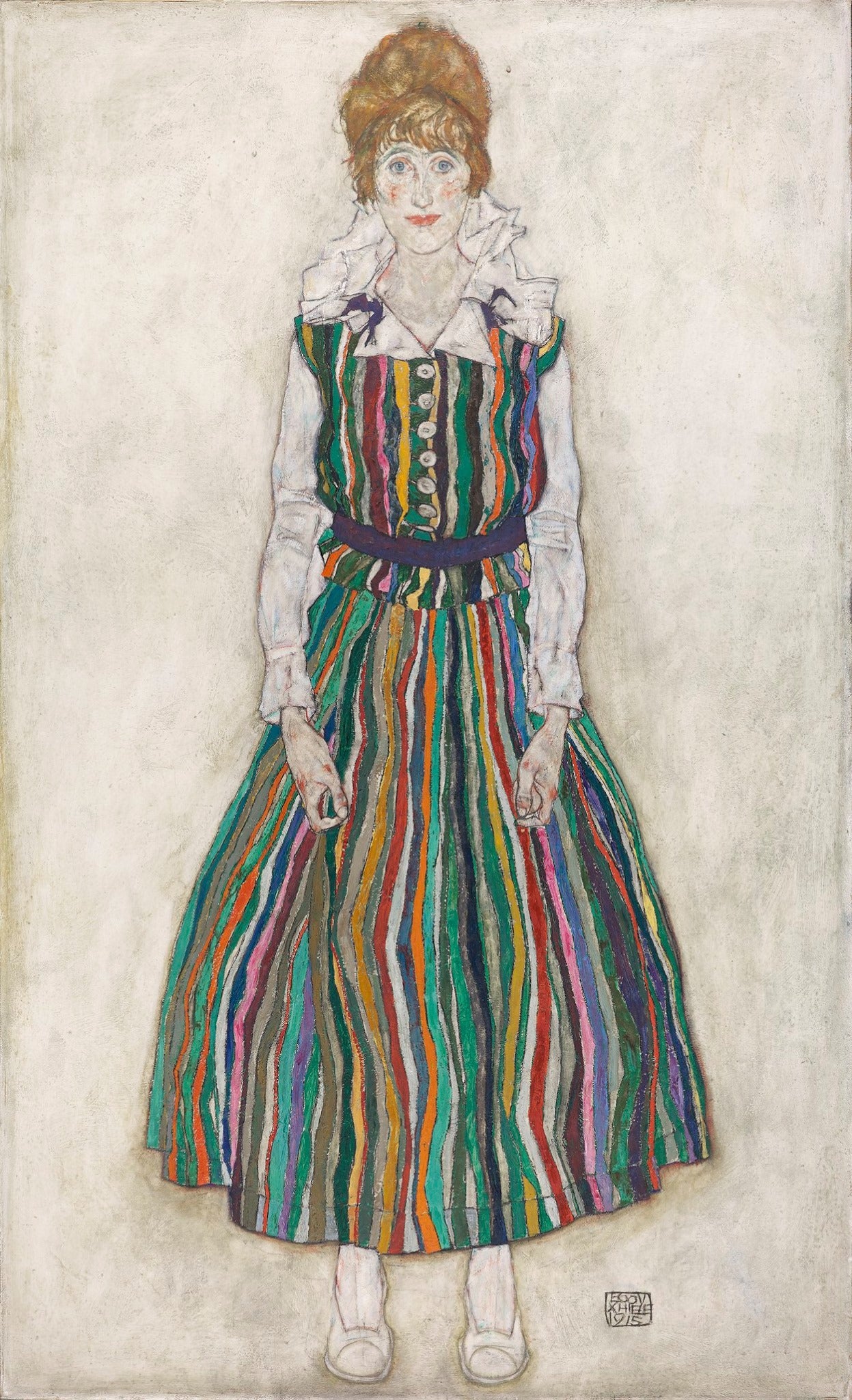 Some background. Hailing from a working-class background, Schiele brushed aside art-world rules. Enter Edith, the young girl next door. Their love story escalated fast; they married just before Schiele was conscripted. It was World War I that changed him, but from its chaos emerged ‘Portrait of Edith’, capturing her vulnerability and his. Edith is blushing, not of excitement, but with embarrassment.