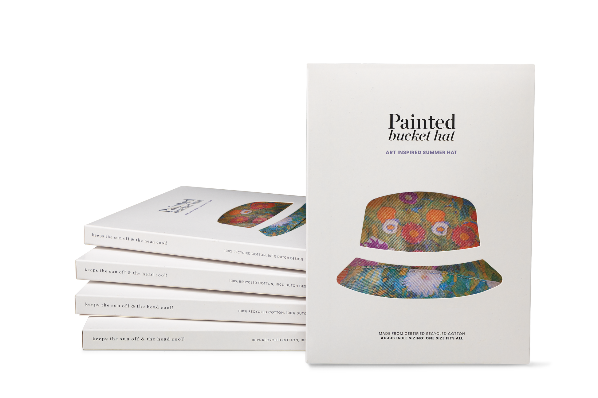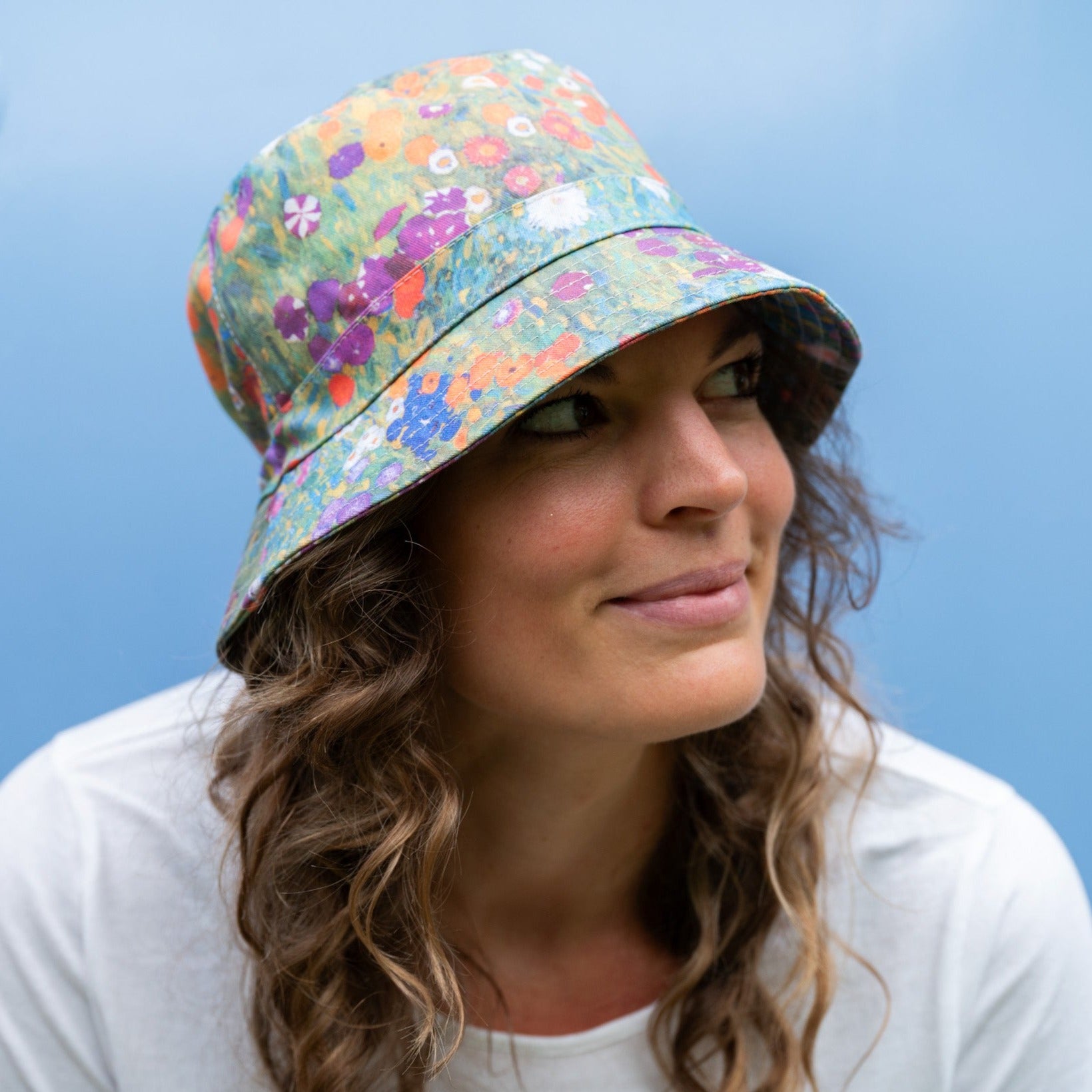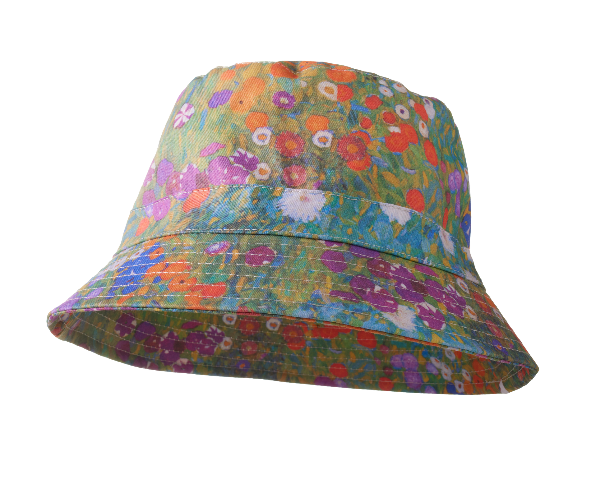This cotton hat is inspired by Gustav Klimt’s brilliantly coloured painting of a blossoming flower garden. Most of us know Klimt from his romantic portraits of women with a lot of gold and glitter, but Klimt made deeply researched paintings of the natural world, especially after he visited a large Van Gogh exhibition in Vienna in 1906.