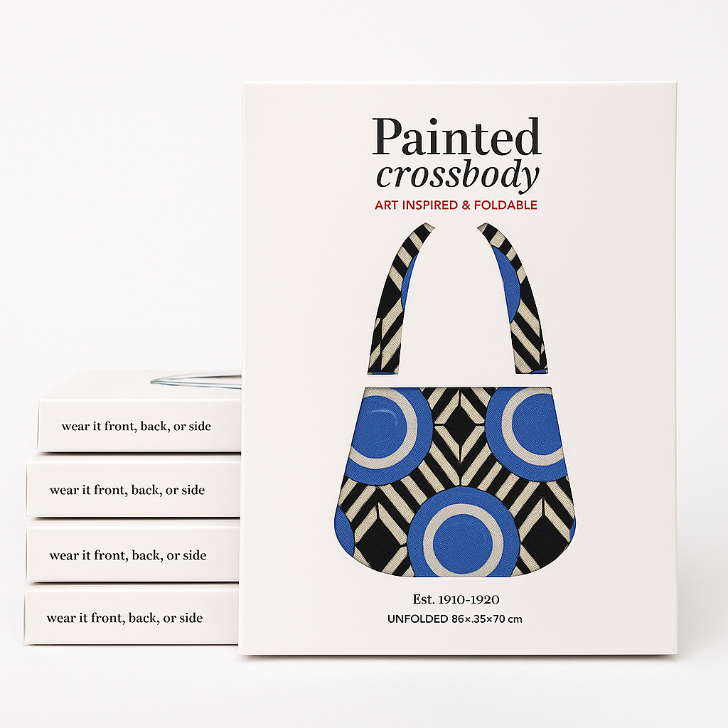 This foldable crossbody bag is inspired by a fabric design of Lyubov Popova, a rebel painter who danced to her own avant-garde groove in the early 20th century. Born in 1889, she was like the cool cousin of Kandinsky and Malevich, turning heads and breaking rules in the art world. But let’s talk about her pattern designs: imagine colourful geometrics exploding on fabric, with each thread colored exotically.