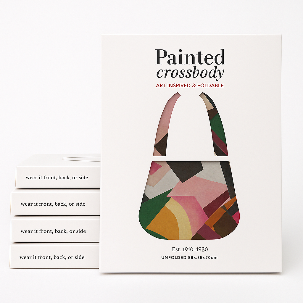 This foldable crossbody bag is inspired by a collage by the Russian painter Olga Rozanova from the early 20th century. She called her collages 'paste-ons': a combination of planes, lines and discs and no incorporation whatsoever of real objects. Rozanova was part of the 'Supremus' which was a group of avant-garde artists (led by Malevich) who turned art into a cosmic showdown of geometric forms, tearing down all academic art rules.