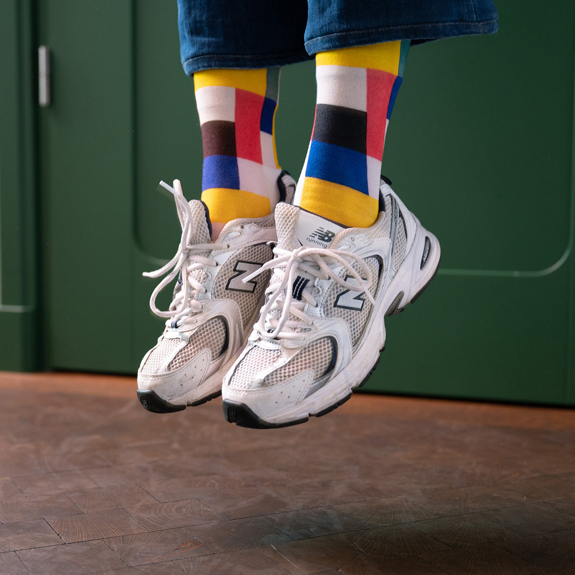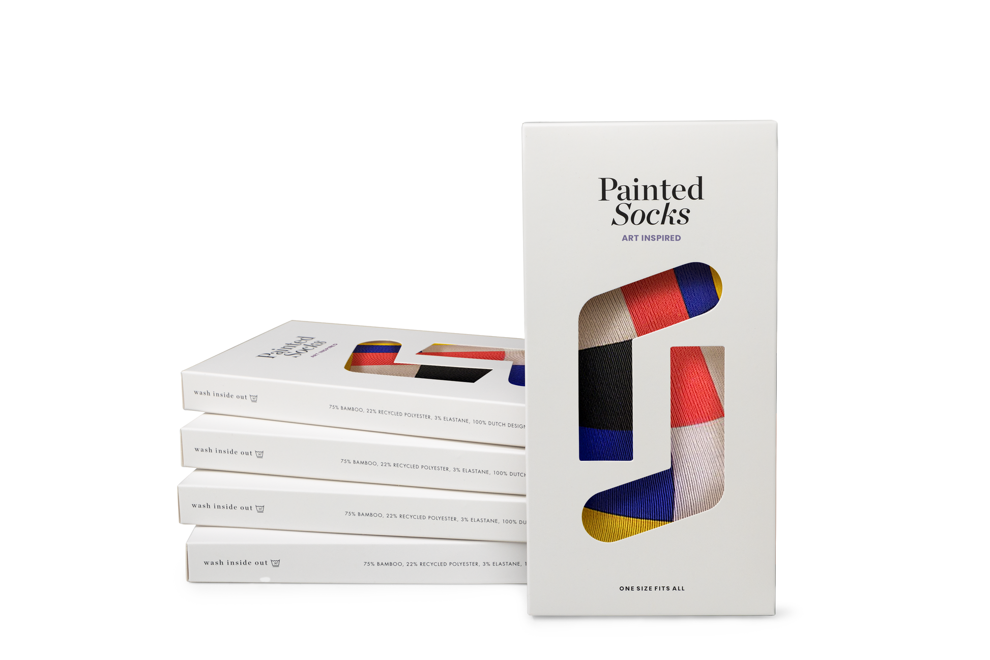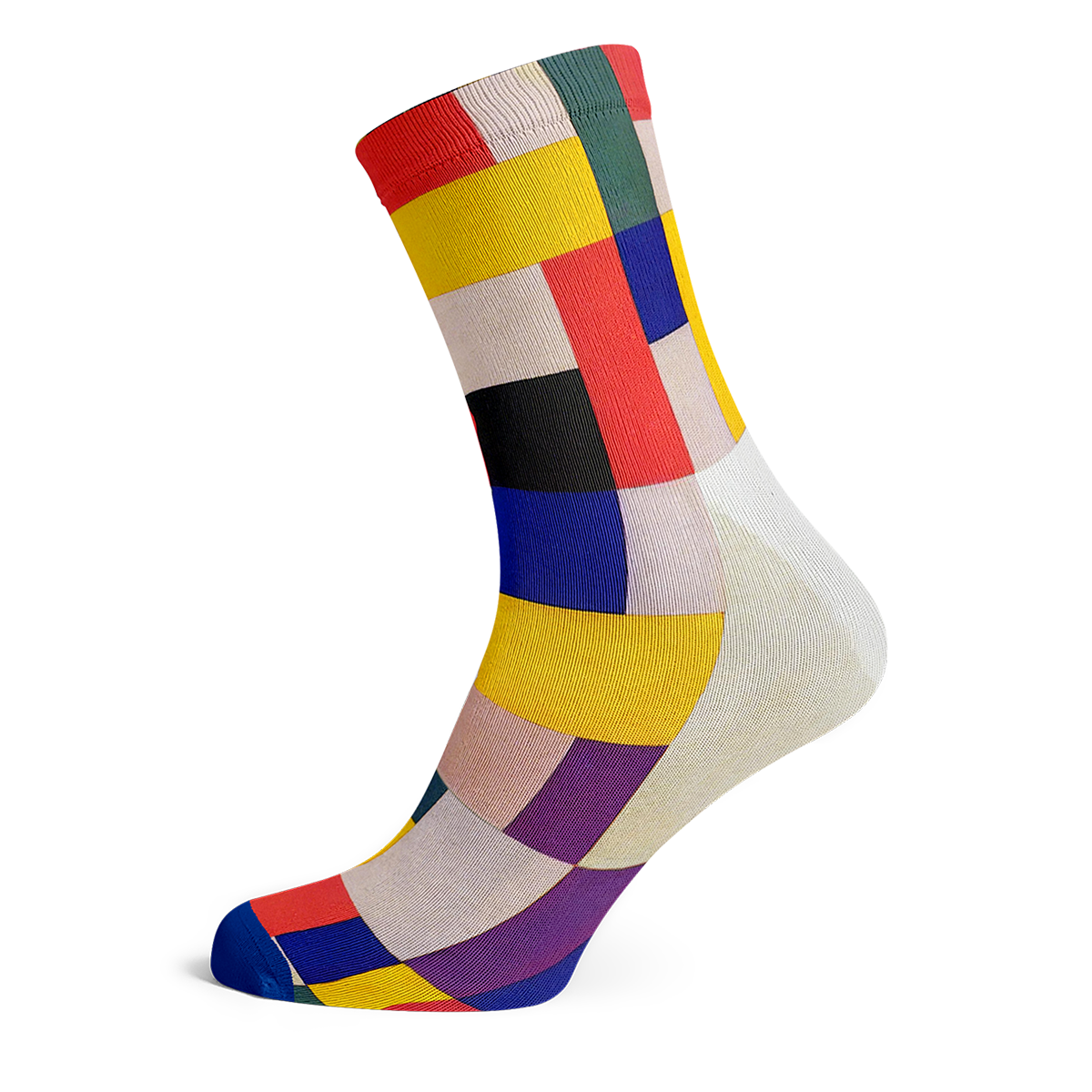 These socks are inspired by pure forms, pure colours and pure beauty. Perhaps you recognize a touch of Mondriaan, the use of primary colors and geometric forms. But what on earth do we see? One can imagine it being a map of a modern city (green for recreational areas, yellow for housing, red for industrial areas) or perhaps we see a collection of human emotions (red for passion, yellow for happiness, blue for trust).