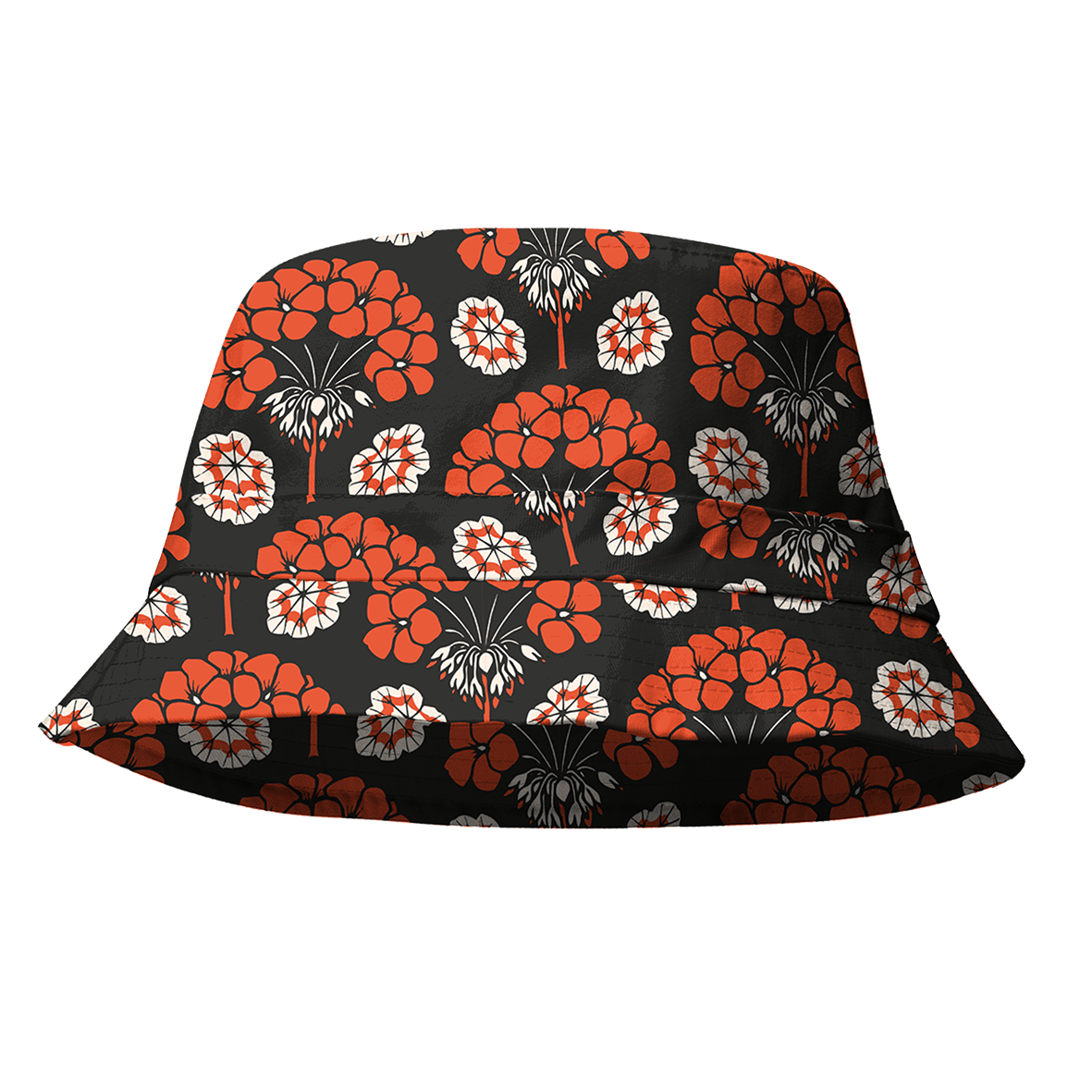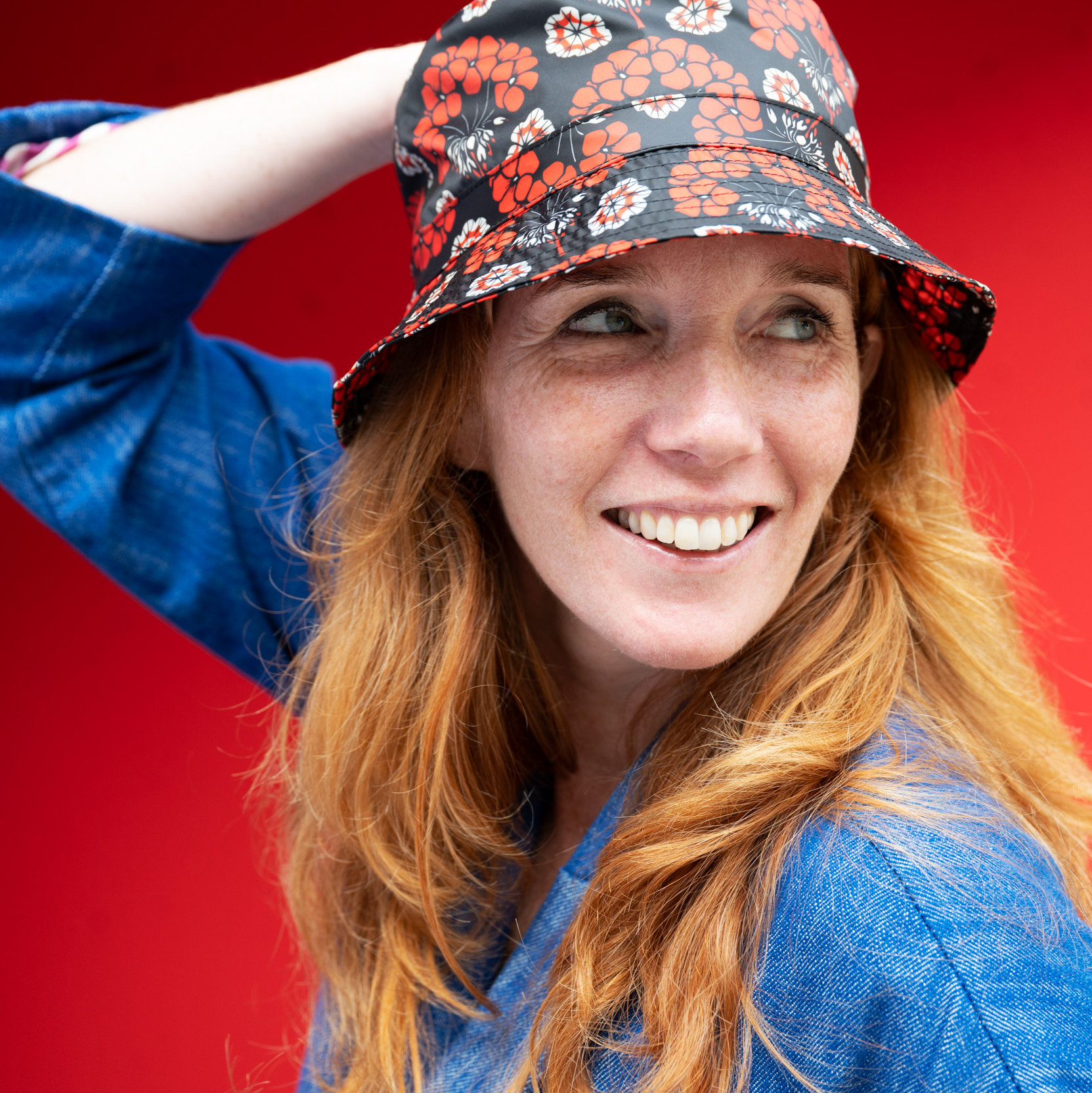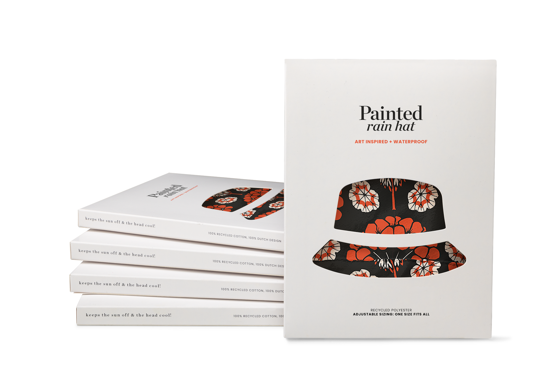 This rain hat is inspired by the work of Dutch artist Julie de Graag (1877 – 1924). In this artwork the East Indian Cherry is depicted, a colorful annual flower which has inspired many artists throughout history. De Graag’s most-used technique was wood-block printing with nature as her favorite subject and abstract as her chosen style.