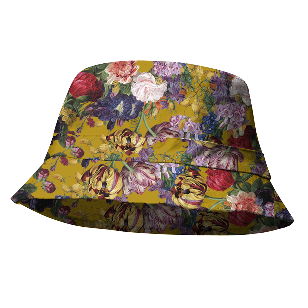 This rain hat is inspired by a 19th century still life painting by Dutch artist Henriëtte Gertruida Knip, not to be confused with her niece and namesake known for cat paintings! Knip is less well known today, but she was no average painter. Even at a young age, her still-lifes in oil and watercolour were immensely popular! Imagine a medley of roses, tulips, ladies’ purses and mysterious black irises – all flamenco in a vase.