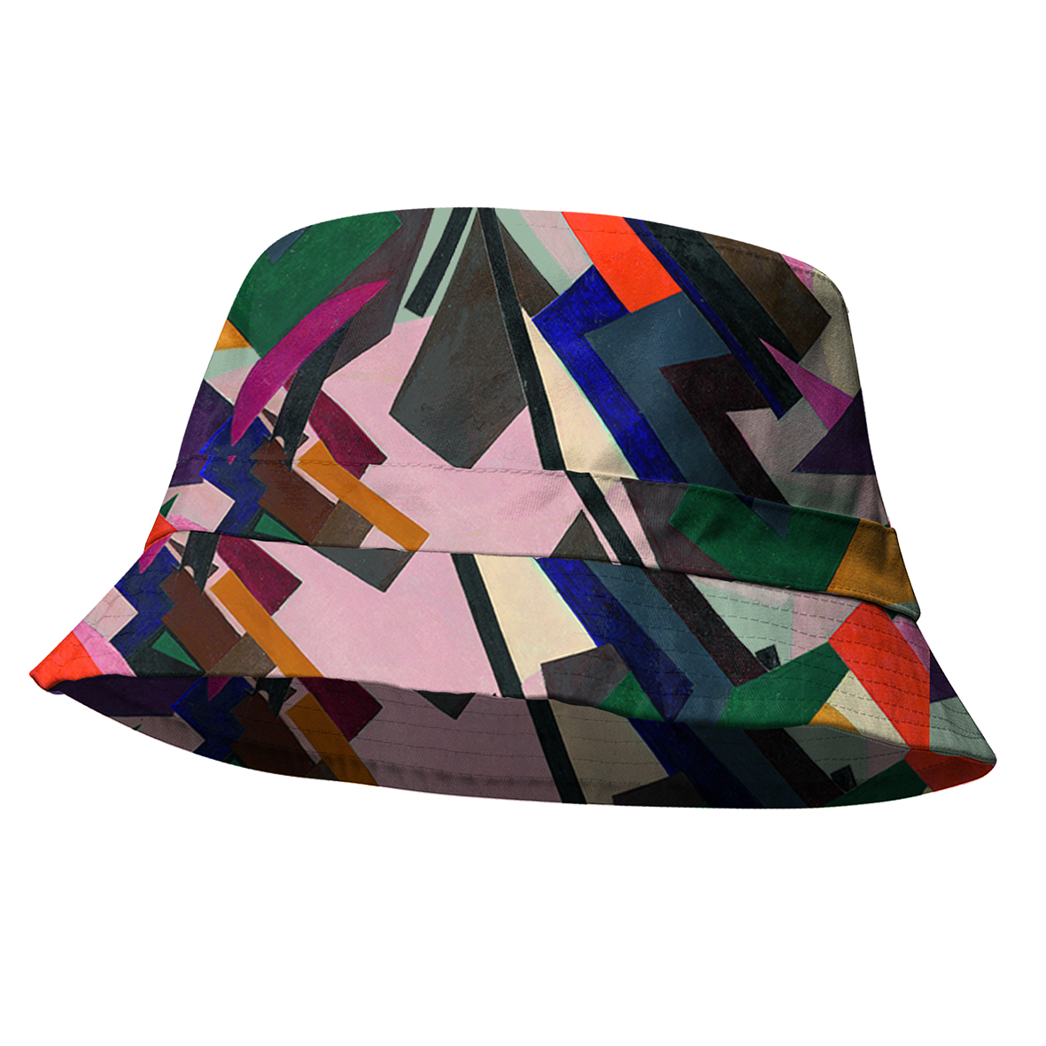 This rain hat is inspired by a collage by the Russian painter Olga Rozanova from the early 20th century. She called her collages 'paste-ons': a combination of planes, lines and discs and no incorporation whatsoever of real objects. Rozanova was part of the 'Supremus' which was a group of avant-garde artists (led by Malevich) who turned art into a cosmic showdown of geometric forms, tearing down all academic art rules.