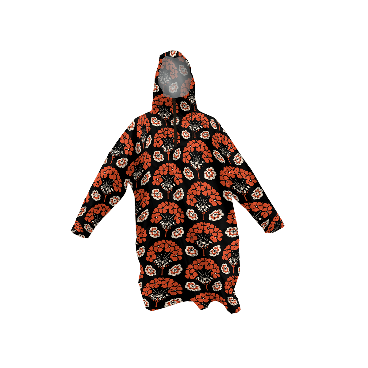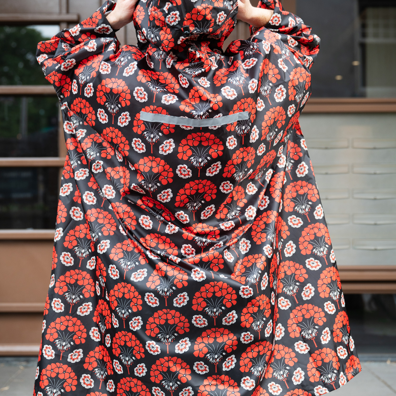 This rainponcho is inspired by the work of Dutch artist Julie de Graag (1877 – 1924). In this artwork the East Indian Cherry is depicted, a colourful annual flower which has inspired many artists throughout history. De Graag’s most-used technique was wood-block printing with nature as her favorite subject and abstract as her chosen style.