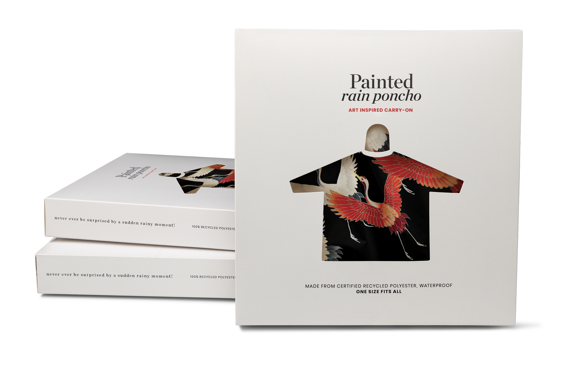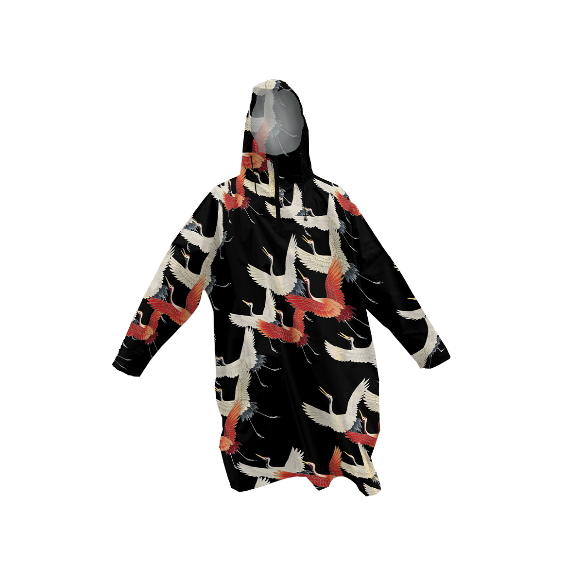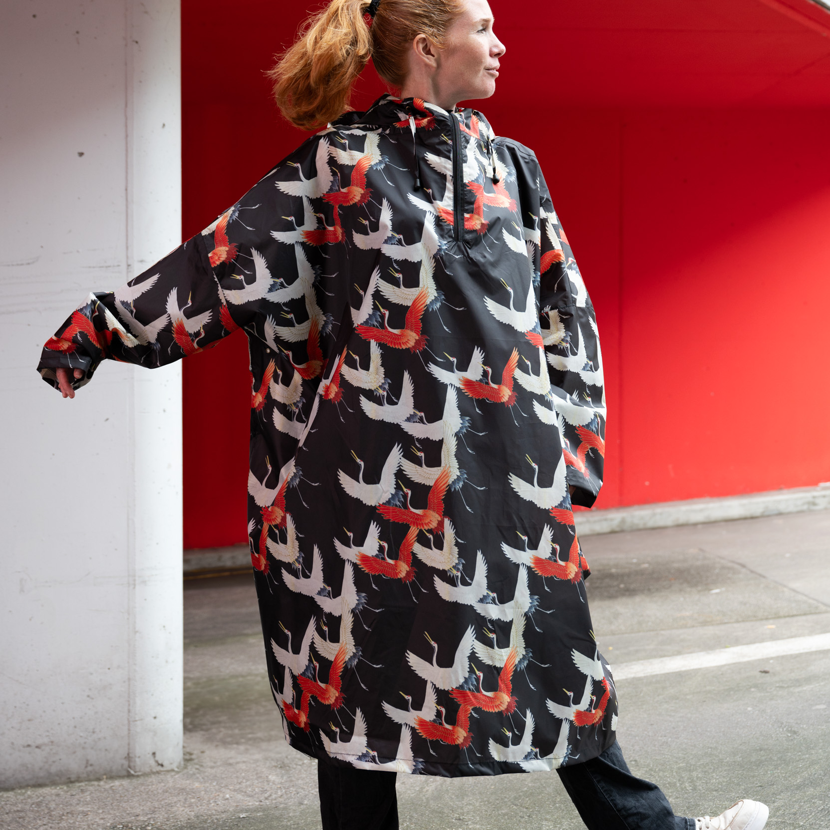 This rainponcho is inspired by a pattern design of Japanese cranes, pictured on a 100-year old 'furisode'. This is a precious Japanese kimono only worn by young, unmarried women. The word 'kimono’ literally means ‘something to wear’, a slight hint that the most important feature is its pattern, taken from nature and bursting with symbolism.