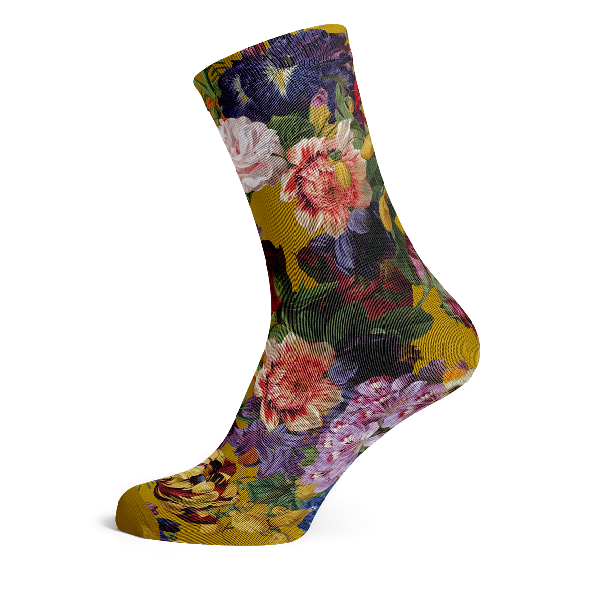 These socks are inspired by a 19th century still life painting by Dutch artist Henriëtte Gertruida Knip, not to be confused with her niece and namesake known for cat paintings! Knip is less well known today, but she was no average painter. Even at a young age, her still-lifes in oil and watercolour were immensely popular! Imagine a medley of roses, tulips, ladies’ purses and mysterious black irises – all flamenco in a vase.