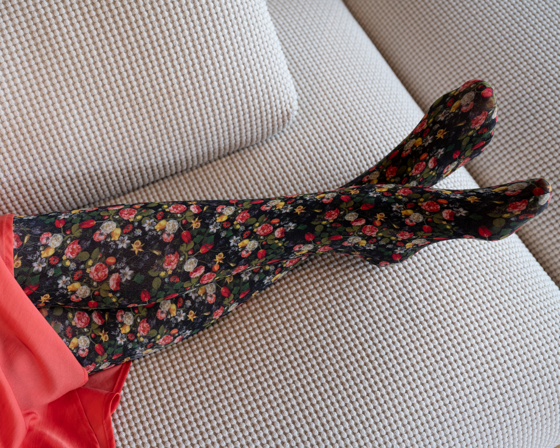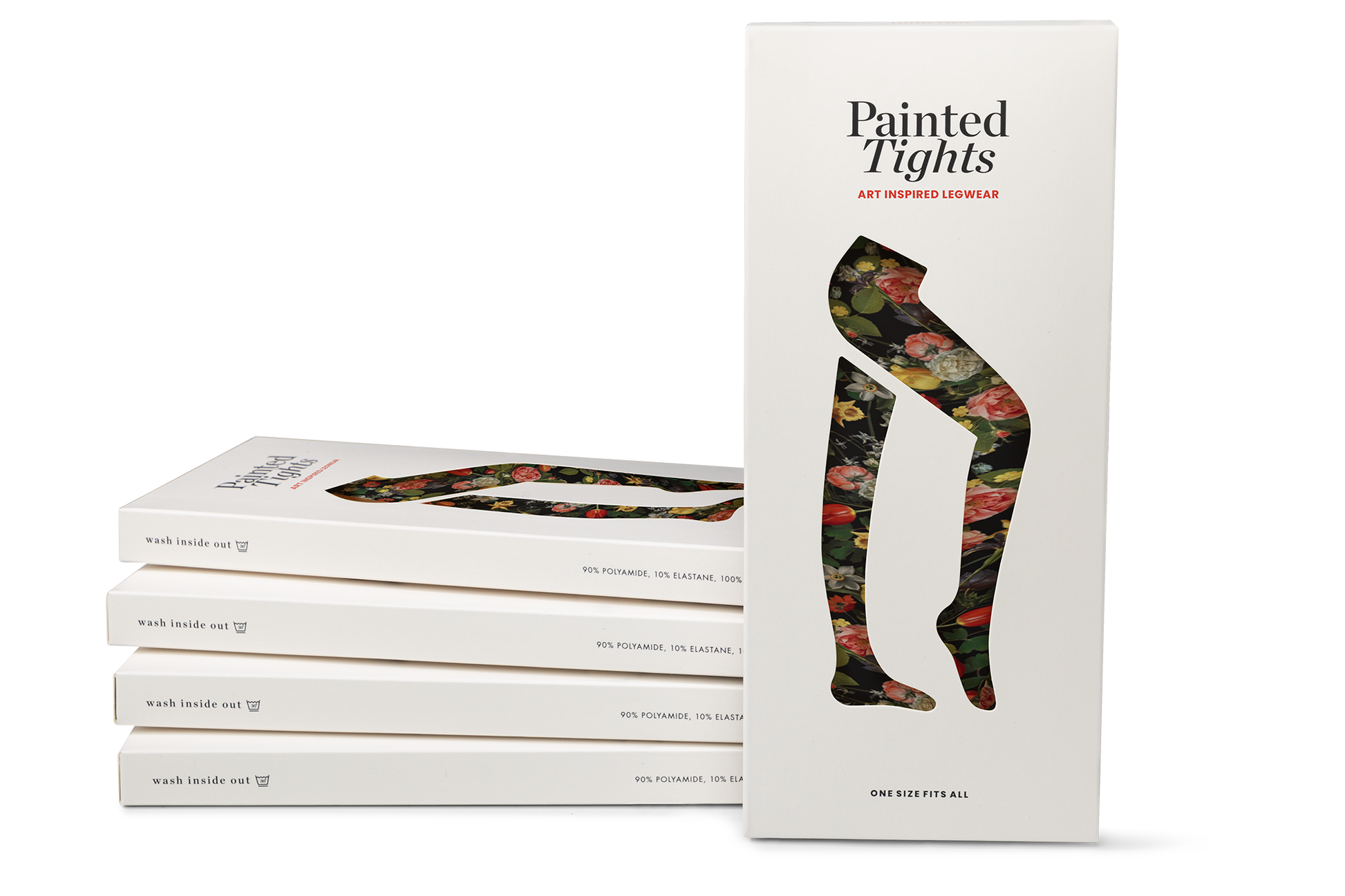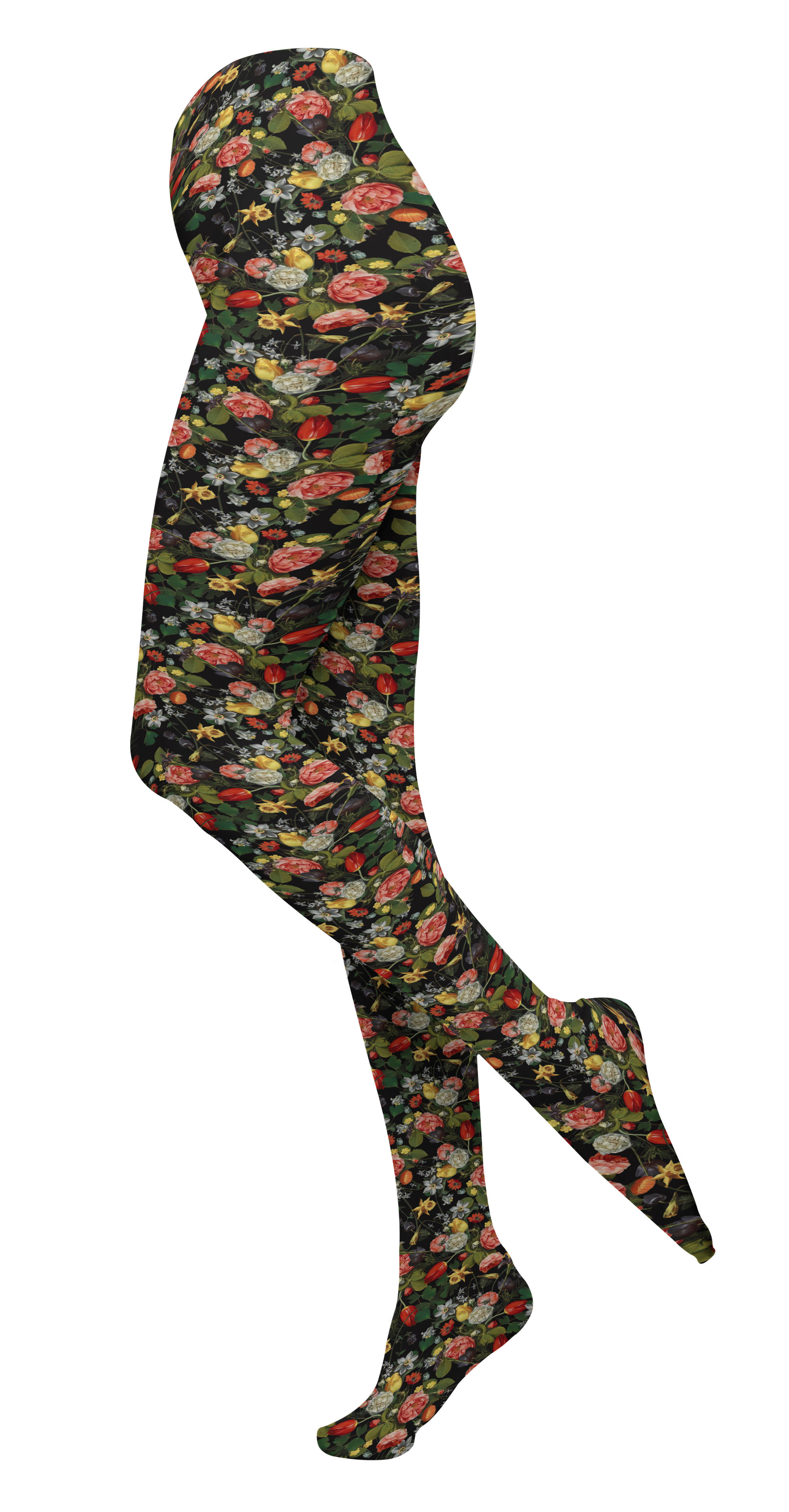 These tights are inspired by a sparkling bouquet featured in a larger still-life painting by Clara Peeters. Born around 1588 in Antwerp, Clara was among the few professional female painters of the 17th century. Her banquet pieces, known for their detail in depicting magnificent flowers alongside food, cups and other attributes, left an influence on painters from the Northern Netherlands.